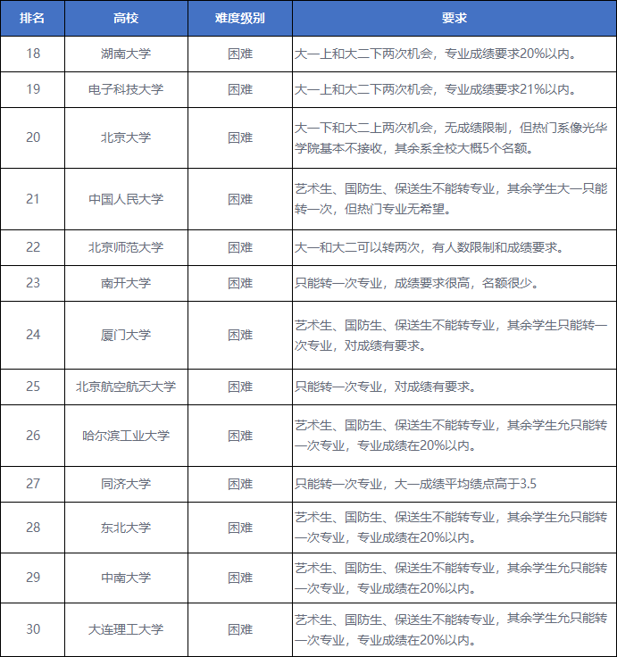 这些大学大多要求艺术生、国防生以及保送生不能转专业,而且大多对专业成绩提出了相对高的要求。上了大学就知道,想取得全系前20%的成绩是有困难的。