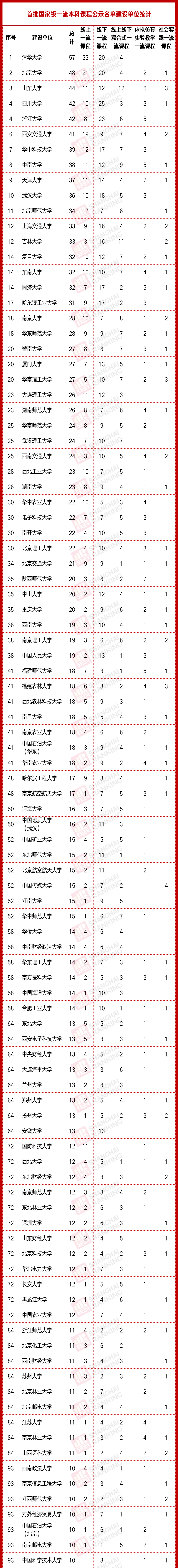 以下为首批国家级一流本科课程公示名单建设单位统计情况:
