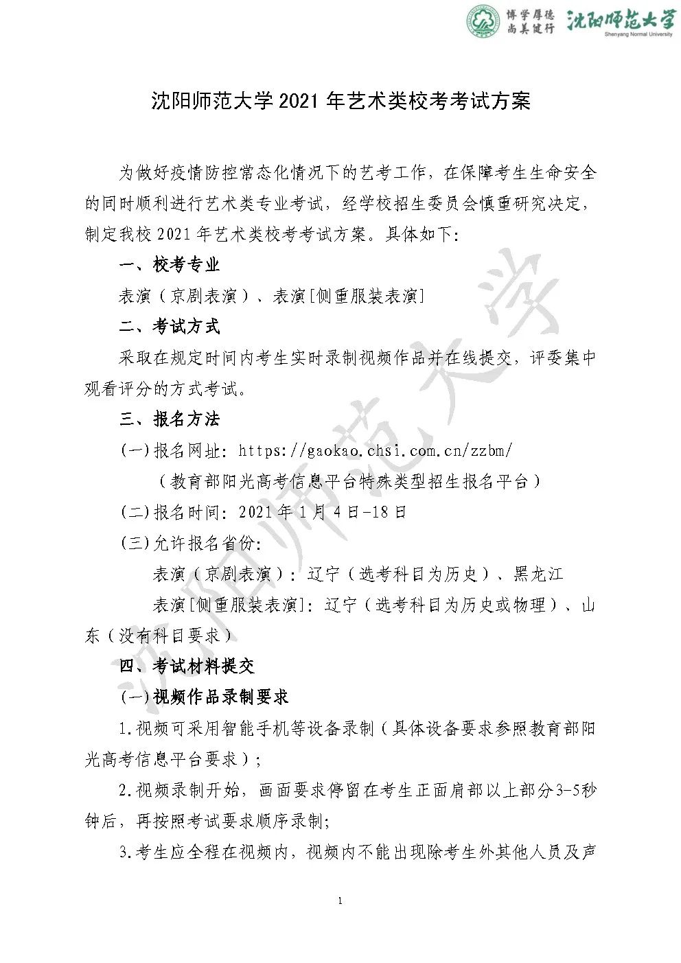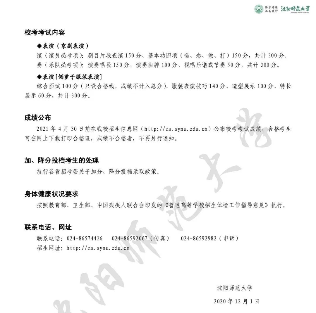 1、沈阳师范大学 2021 年艺术类校考考试方案