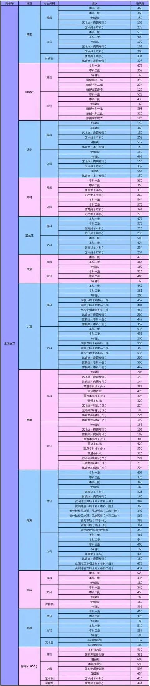 注:海南裸考总分750分,另有基础会考总分10%加分。海南的理综、文综考的是海南卷,语数英考全国Ⅱ卷。西藏取自重点本科批